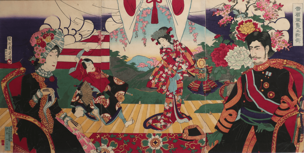Emperor Meiji (right) and Empress Shöken (left) are shown attending a performance of Momijigari in this contemporary commemorative print.