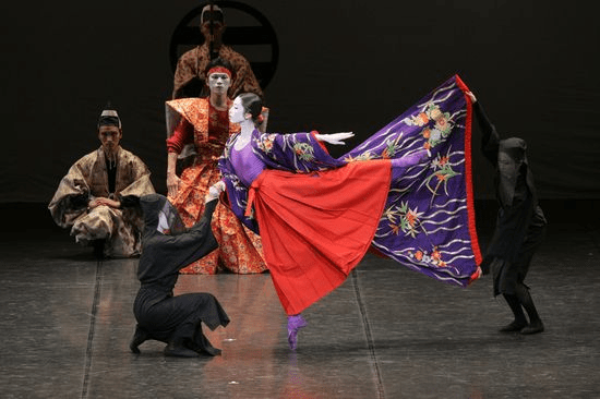 Kabuki combines highly-stylized and often exaggerated dramatic performances with traditional dance. The actors cover their faces in makeup, using specific patterns to represent different character types, and wear lavish, elaborate costumes. Kabuki includes three main types of plays: jidaimono (historical plays), sewamono (contemporary, domestic dramas), and shosagoto (dance-dramas).