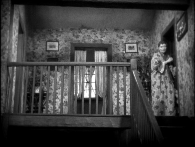Unfortunately, Thirza is still getting ready, and she is suddenly trapped in her bathroom with no way to get to the clothing in the bedroom except by crossing the head of the stairs while Sweetland waits impatiently below. She is thrown into complete disarray when she attempts to sneak across, wrapped tightly in a dressing gown, only to get it caught in the bathroom door. Sweetland doesn’t seem to notice