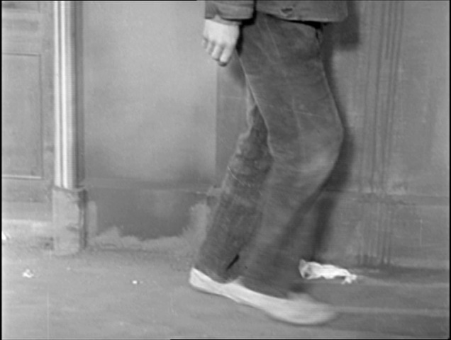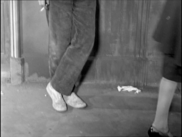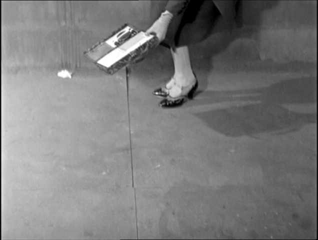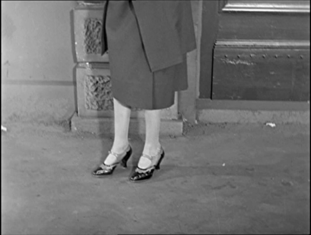 After Betty’s father delivers the bad news about their change of fortune, Betty resolves to sell her jewelry for money to live on. What follows is a true Hitchcockian sequence: Betty walks along the sidewalk, swinging her jewelry box at her side. She passes someone leaning against the wall, who quickly moves to follow her and snatches the jewels. She stops and looks after the retreating person, seemingly at a loss as to what to do, then walks back and picks up the box from the ground, only to find it empty. The entire scene is filmed from the waists of the characters down, using only their legs and feet to convey the action.