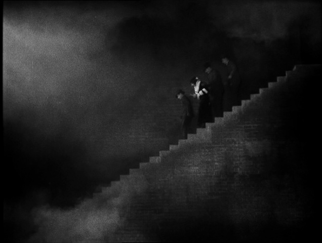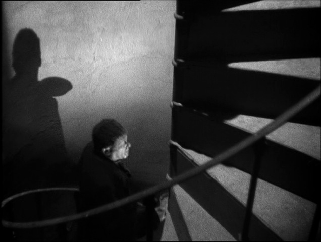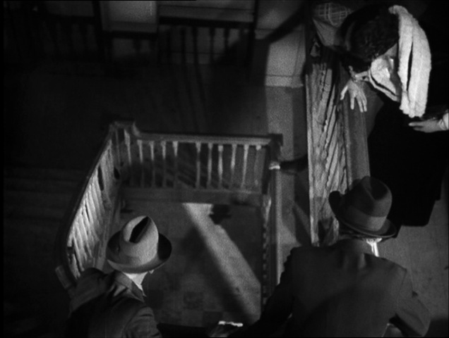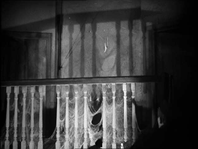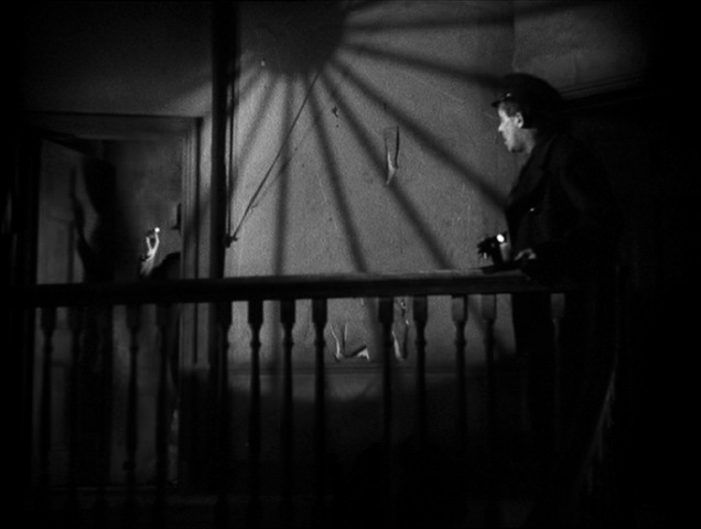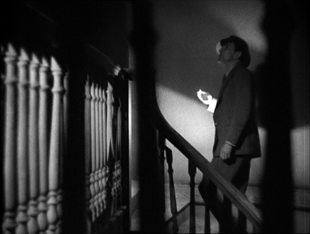 As he makes his way carefully up, another man holding a lit candle peers down from above, but apparently doesn’t see him coming up, wandering off into a side room. As the first man continues to ascend, Hitchcock treats us to all sorts of weird shadows created by the odd shape of the staircase and the faint sources of light. Everything in the house seems to be coated with a thick layer of cobwebs and dust, and the banister is broken in several places. Hitchcock makes great use of this staircase throughout the film, having already shown an aptitude for filming scenes in stairwells in earlier films like Blackmail and The Lodger.