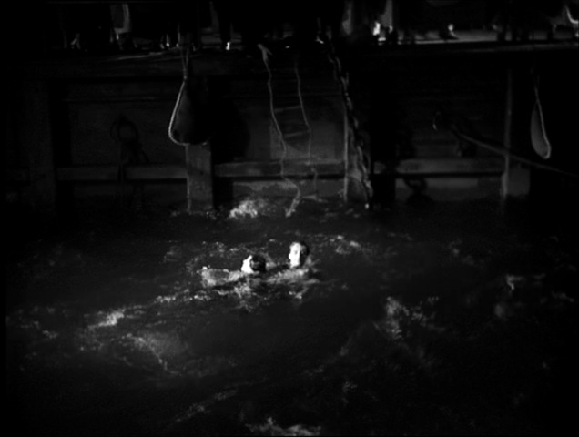 As some of the cars begin to sink, Thorndike, dashing up to the water’s edge, spots Nora inside one of them, handcuffed and hanging on as best she can. He strips off his coat and dives into the water to rescue her. Much to the delight of the gathering crowd, he swims inside the sinking train car and drags her out before it sinks. Ben, not handcuffed but apparently not much of a swimmer either, is left to fend for himself, comically clinging to the outside of another car.