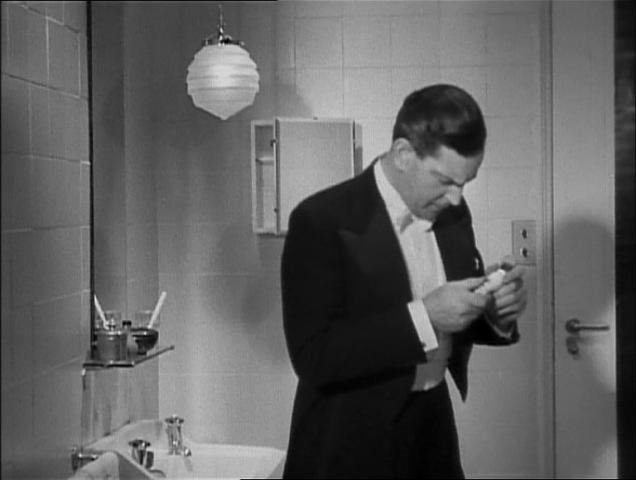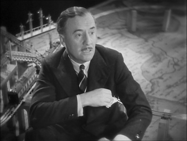 A fadeout transitions us from the natural beauty of the snow-covered alps to the man-made neon chaos of Piccadilly Circus. Lawrence and Jill have returned to England, and continue to say nothing about events in Switzerland. They are visited at home by a few men from the police. Lawrence fields their probing questions while Jill paces nervously in Betty’s playroom upstairs. Keeping her company is Clive (Hugh Wakefield), whose precise relationship to the family is never revealed. He is either a close family friend or, more likely, Betty’s uncle. His role in the story is that of moderately-useful comic relief. In an amusing visual nod to Hitchcock’s previous film, Clive is playing with a model train.