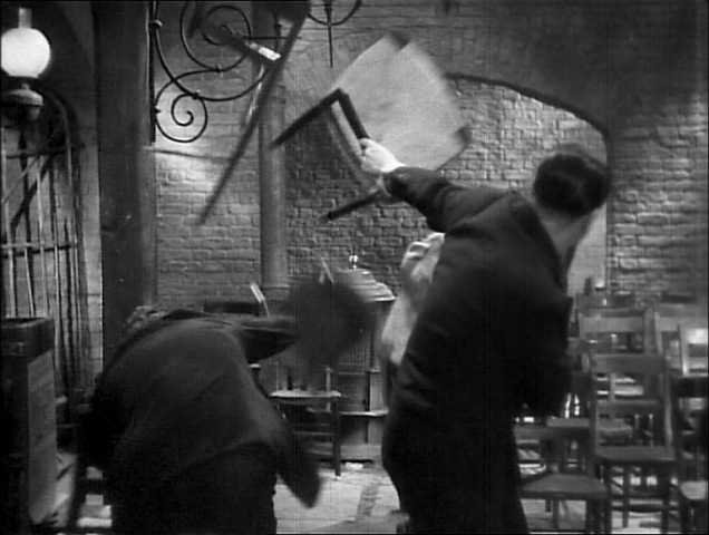 Abbott appears, offers him a cigarette, and reminds Mrs. Sprocket to collect Lawrence’s gun (his “offering”), while revealing that he knew Lawrence had switched places with the dentist. Lawrence cleverly tricks Mrs. Sprocket into revealing that his daughter is somewhere on the premises, then smashes Ramon’s gun out of his hand as he tries to get past. There are several enemies present, but they are afraid to draw the police if they shoot. Instead, a somewhat quieter battle ensues, as Lawrence and the other men throw chairs at each other. Mrs. Sprocket ascends to the organ to drown out the ruckus, and the whole scene takes on a very comical sense of menace. The situation is just so absurd.