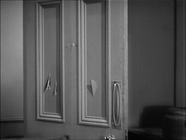 Each shooter has one remaining shot, but Jill spoils her mother’s aim by making noise. In actuality, the noise is Abbott’s fault. He shows her his gently-chiming Swiss watch at the crucial moment. The noise made by the watch is immediately associated with this character, who will later be revealed as the villain. It is quite possible that Hitch intended the sound association as a sly reference to Lorre’s character in M, whose