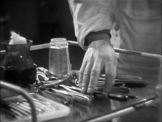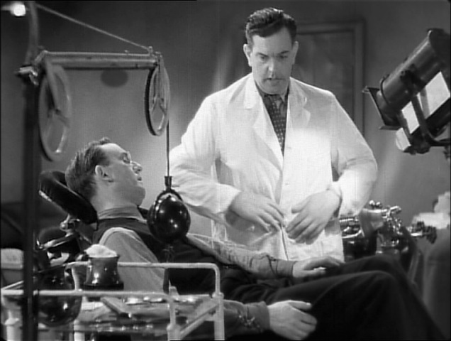 The ensuing scene (which was originally intended to take place in a barber shop, until Hitchcock saw a scene just like it in I Am A Fugitive From A Chain Gang) is a spine-tingling example of sustained suspense. Barbor gets Lawrence into the chair and peers into his mouth. The camera gives us an uncomfortable close-up of a tray full of