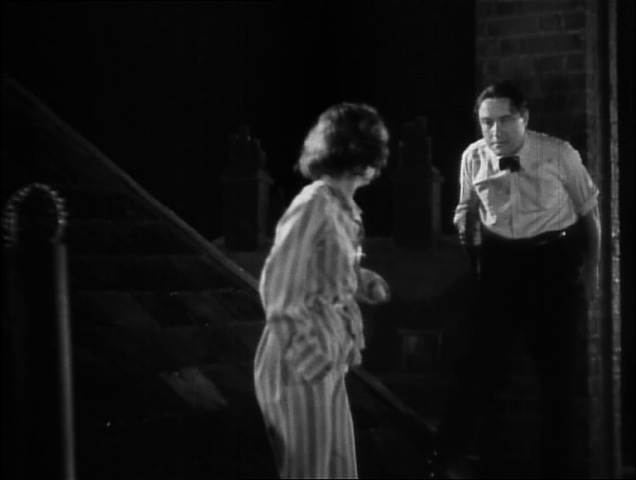 Hearing someone coming up the stairs, Lawrence quickly puts on the unconscious dentist’s coat and glasses and aims the bright light at the door. Just as he bends over his “patient,” Ramon walks in the door. “Has he come?” he asks, and Lawrence points to the door Abbott just walked through. Just then, Abbott comes out and the two have a brief discussion, wherein they hint that they are going to the place where Betty is hidden.