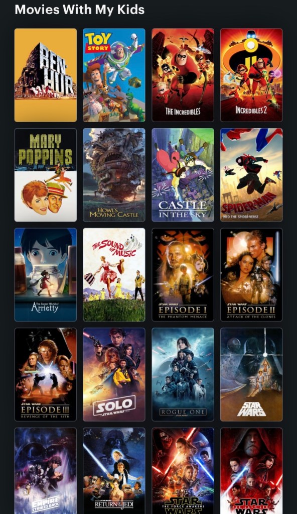 Ben-Hur is where the list of movies I was intentionally sharing with my kids begins, and sprinkled throughout are the kinds of movies I already talked about: Disney, Pixar, Studio Ghibli. Also, their cub scout pack hosted a Star Wars marathon last summer, so we watched them all again over a couple of days.