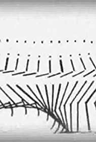 A series of figures comprised of dots and lines, vaguely resembling a stick-figure representation of a person, appear one-by-one across the screen, filling the frame from right to left. Each is configured slightly differently from the one before it as the stick figure “walks” by swinging its “arm” and raising and lowering its “leg.”