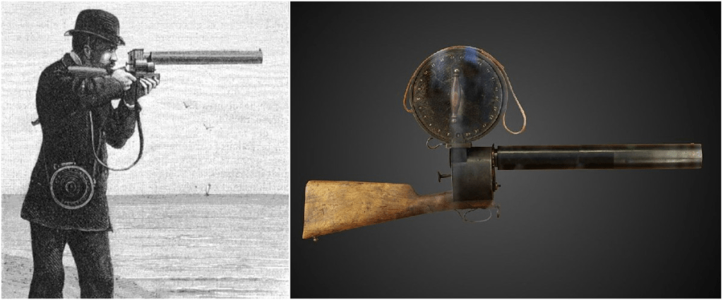 Probably the most obvious difference lies in what they each produced. We’ve already seen several examples of Muybridge’s sequences of photographs shot by a series of a few dozen cameras triggered one after the other. Marey designed a single apparatus that could take several images in a sequence and record them all on the same plate. He called this device the “chronophotographic gun.” Marey’s invention was inspired by the much larger “Janssen revolver” that Janssen used to capture the transit of Venus across the sun in 1874, and Janssen’s design was, in turn, inspired by (and named after) the Colt revolver. So the “gun” label was entirely appropriate. Plus . . . Well, just look at it: