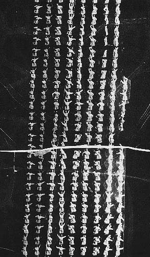 So, if Edison returned with fresh ideas in the fall of 1889, why was Dickson still experimenting with cylinders in 1890? There is actually a disagreement over whether these were produced in June of 1889 or November of 1890, with evidence that supports both claims. It certainly makes sense that they could be from before Edison’s Paris trip. On the other hand, some sources suggest Edison’s initial idea was to record the images directly onto the cylinder, and that they experimented with different materials for the cylinder and different coatings. But the surviving Monkeyshines actually consist of images on photosensitive paper (as seen at left) wrapped around a cylinder rather than recorded directly on it, suggesting that they spent additional time on successive iterations of the cylinder idea.