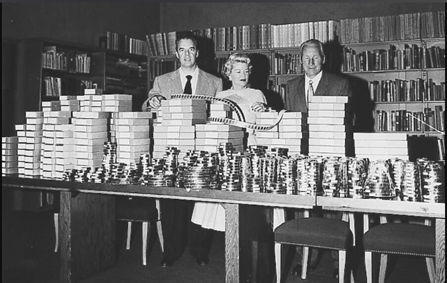 Over 5,000 films were archived this way, and then apparently they were mostly forgotten. The collection was rediscovered in the 1930s, and eventually the Academy of Motion Picture Arts and Sciences (AMPAS) was able to fund a restoration project. In 1953, they hired a man named Kemp Niver, a private detective, to convert these paper prints back into film (that’s him on the far left of the photograph). Ultimately, he was able to salvage 3,600 of the stored films, but it took him over a decade.