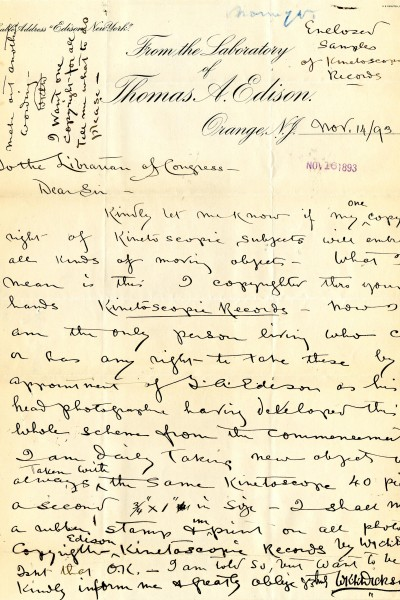 When Edison began producing films for commercial purposes in the mid-1890s, there was no provision in copyright law to protect the works of this new medium, but there were copyright protections (dating back to 1865) for photographs. Copyright law would not be amended until 1912, and until then, filmmakers produced paper prints of every frame of their motion pictures and submitted them to be copyrighted as photographs. This arrangement had other advantages as well, as early motion pictures were mostly made on nitrate stock, a highly-flammable substance that requires special handling to be stored safely. In 1894, the Library of Congress simply didn’t have a way to do that.
