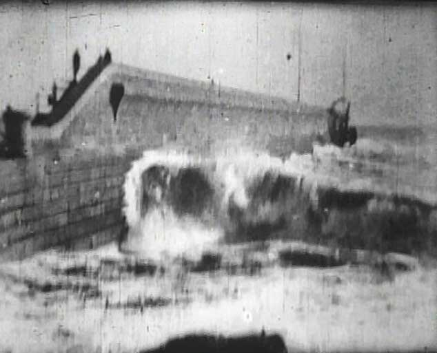 Waves crash and break violently against a sea wall that juts out into the water. Also included in this clip is a second shot, most definitely not of the ocean at Dover. It isn’t known whether this shot was always part of the original film, but it is certainly footage from a different location, possibly the river above Niagara Falls.