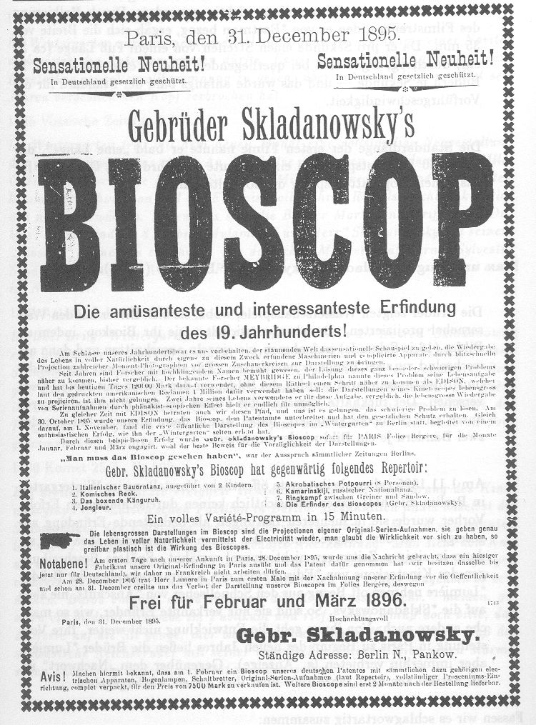 After arriving in both Paris and in London for engagements with their bioscop, only to find newly-invented (and somewhat superior) projectors had already appeared just ahead of them, the Skladanowsky brothers must have felt at least a little unlucky. The poster to the right shows that they leapt into action while they were still in France. It gives the date as December 31, 1895 (a mere three days after their arrival), and launches into a brash bit of personal mythmaking, bragging about how their invention has solved a problem that stumped the likes of Muybridge and Edison.