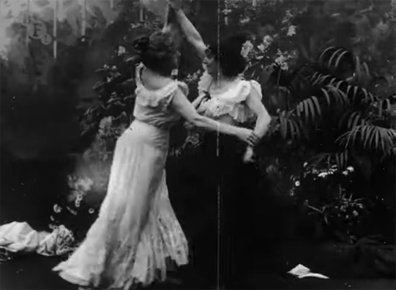 Dickson had come a long way since his days filming these kinds of scenes in the Black Maria. Instead of a black backdrop, there is painted scenery effectively combined with real plants to create an actual setting. The framing doesn’t feel as confining as it generally did for similar acts in the Black Maria. The women have plenty of room to maneuver without ever looking like they are constrained by the space.