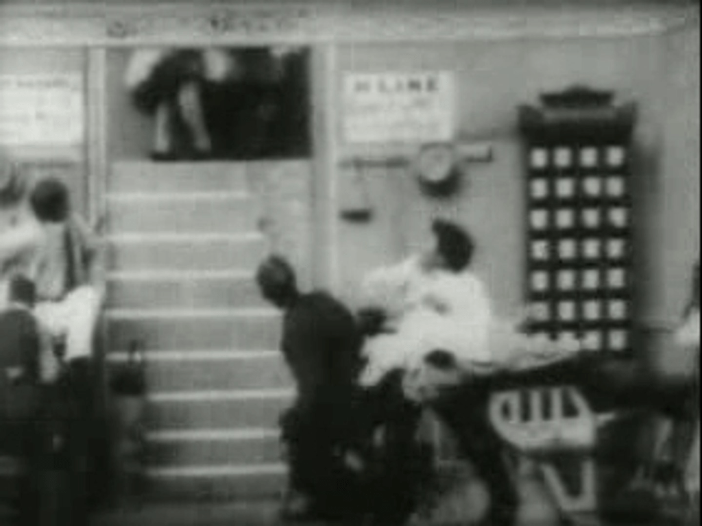 This film is basically a single joke, repeated and drawn out well beyond the point where everyone watching would “get it.” But within that thematic structure, there are several individual gags, probably including a few that are not decipherable without some restoration. The quality of the film as it is available currently makes it impossible to read the two signs that are on the wall flanking the stairs, though we know from The Barbershop that these may have been a source of some additional humor.