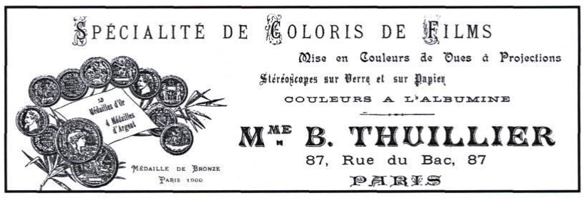 By the time they began coloring films for Méliès, Berthe was 30 years old, and Élisabeth had been a colorist for over 20 years. Élisabeth was a widowed single mother in the mid-1870s, with Berthe her third and only surviving child, when she first began applying color to photographs. She must have been quite good at it. By the time she and Berthe were overseeing the tinting of Méliès’s films, they employed 220 women. Élisabeth (and later Berthe, after her mother’s death in 1907) would select and sample the colors, and then give instructions for the colorists to follow.