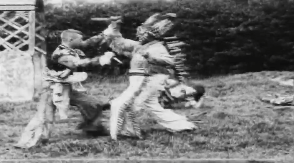 That pair of cowboys who arrive at the end are the only solid indication (aside from the first Indian) as to the actual genre or setting of this film. It is also not typical to see women in most of the roles that they take in this film. The explanation may be as simple as what performers happened to be available at the time. And, of course, as perhaps the earliest narrative Western film, there are no pre-existing tropes for this film to ignore. Also, the filmmakers clearly have very little awareness of details like the actual appearance of Western-style or Native American dress, or what the motivation or composition of a Native American raid on settlers might be.