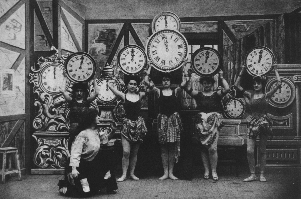 In this dream, the bedroom clock first chases a horrified Cendrillon around the room, and then the clock gnome leaps out of it and begins to hammer on a bell. He rings it exactly 12 times as four dancers emerge, then disappears to be replaced by a fifth dancer in the center. All five hold clocks set to midnight, which they wave in Cendrillon’s face. Then they, too, transform into clocks (still set to midnight) and begin to dance. Turning back into their original form, they unite and transform again into one giant clock. The clock gnome reappears in its center and mocks Cendrillon before she finally wakes up.