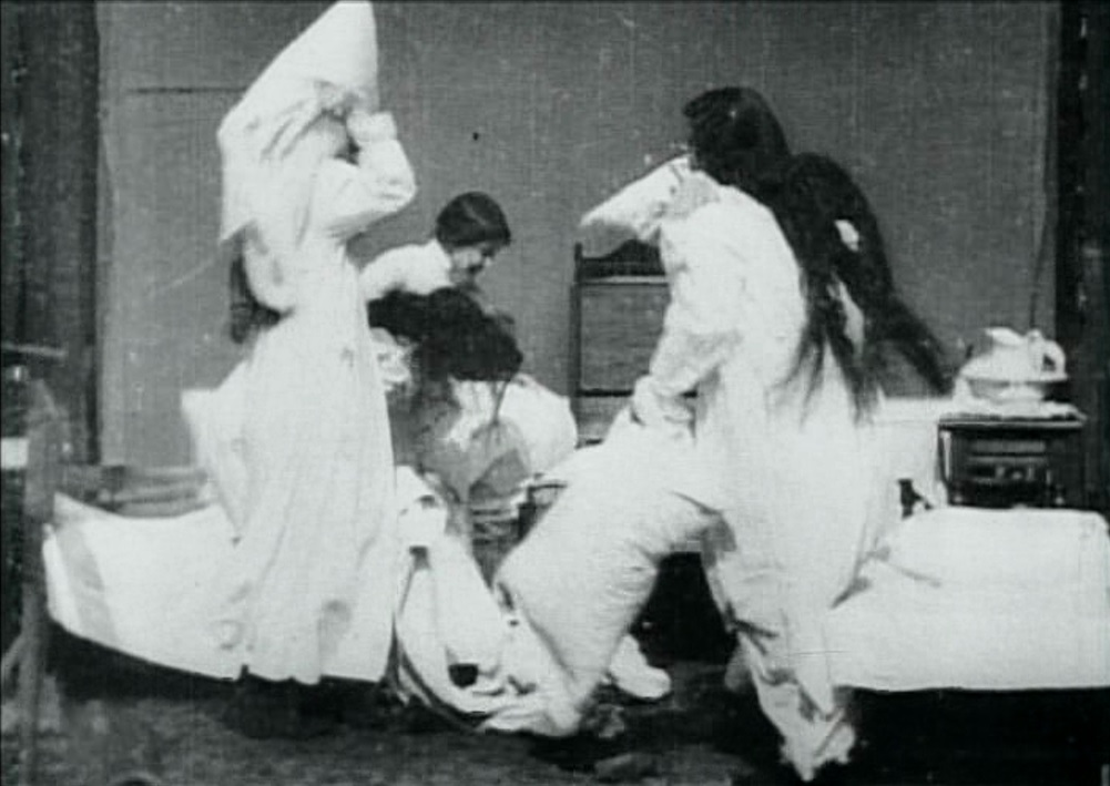 Whatever the appeal, the idea was popular enough that several more “pillow fight” movies (without the “seminary” context) followed over the next several years, from various studios. In fact, Heise filmed one for Edison only about a month later. Musser claims that this second film was a remake of an American Mutoscope Company film, but doesn’t give a title or production or release date, and doesn’t mention Seminary Girls at all. It may or may not be an earlier film than Seminary Girls, but as virtually all of the later pillow fight movies have “Pillow Fight” in the title, it is distinctly possible that this one began the trend.