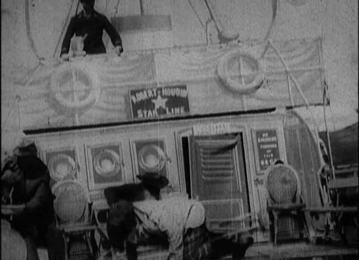 Méliès had originally constructed the platform for an earlier film, Combat Naval en Grèce, depicting a fictional naval battle in the brief Greco-Turkish War, fought that spring. This appears to be functionally the exact same ship set, but with a different paint job, props, and backdrop. One notable addition is the sign designating the ship as part of the “Robert-Houdin Star Line,” in reference to the Théâtre Robert-Houdin (where Méliès still performed his magic act) and to the “Star Film Company” (under which Méliès produced his movies).