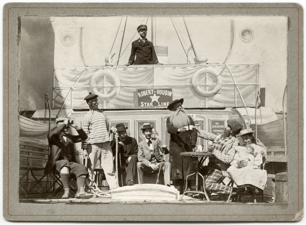 Georges Méliès’s innovative cleverness as a filmmaker did not begin and end with camera tricks. In addition to a natural flair for showmanship before the camera, Méliès excelled at set design. In this case, the ship set was constructed atop a special platform in Méliès’s garden that rocked the entire thing back and forth to simulate an ocean voyage. Some viewers have wondered whether this platform rocked the ship itself, or the just camera. Close observation reveals a few points where the table rocks with the motion of the ship. (The performers definitely cause it to move in spots, but it unmistakably moves on its own at 0:38.) However, based on how little it moves, it is evident that the motion of the set is not so violent as to cause issues for the actors. Instead, they are able to react in unison, and exaggerate their reactions as necessary for comic effect.